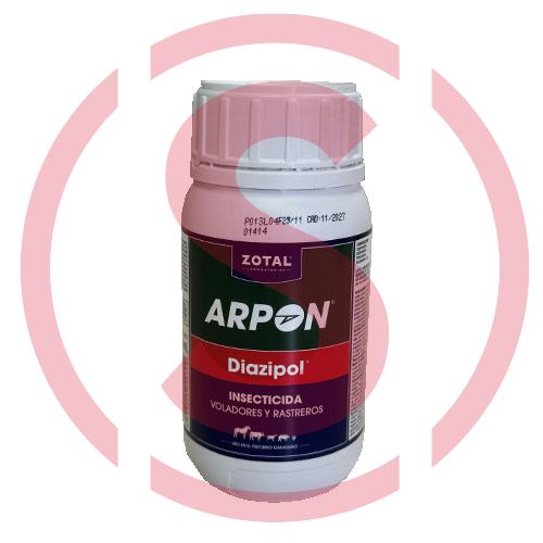 Mezclar ARPÓN® Diazipol con agua en concentraciones del 0.3% al 1%, según el grado de infestación. Aplicar la mezcla por pulverización, usando 5 litros por cada 100 m² en superficies impermeables o 10 litros por cada 100 m² en superficies no impermeables. Utilizar la emulsión antes de 12 horas. Aplicar sin presencia de animales y esperar un plazo de seguridad de 24-48 horas.